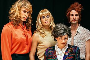 Amine Adjina : C’est la mère, mais elle n’est jamais là ! Cette mère est partie et ses quatre enfants, trois hommes et une femme, l’incarnent sur scène. Au fur et à mesure, ils en viennent à se travestir. L’autre figure importante de la pièce est Victor Newman, le héros des Feux de l’amour, une figure patriarcale, sorte de cliché masculin de la virilité.